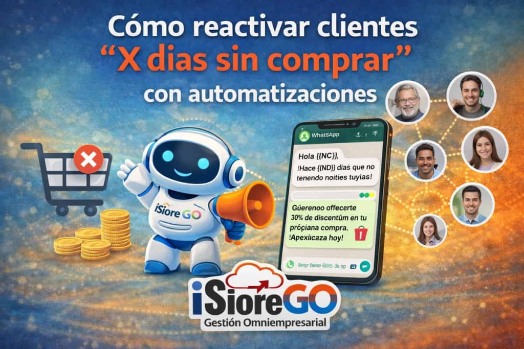 TL;DR: Reactivar clientes “X días sin comprar” no es una campaña suelta: es un sistema. Primero conviertes ese criterio (“última compra hace X días”) en un segmento reutilizable (no una lista armada a mano), luego lo activas con una secuencia por etapas (no un mensaje único) y, por último, lo conectas a operación + medición para que el recontacto genere recompra (y no solo respuestas). En iSiore GO lo abordamos desde segmentación (listas/etiquetas/públicos), campañas y automatizaciones tipo workflow para que el seguimiento no dependa de la memoria del equipo; además dejamos trazabilidad por cliente para auditar qué se envió, cuándo y qué pasó después. Normalmente esto vive en nuestro CRM y, cuando tu “X días sin comprar” necesita apoyarse en datos transaccionales, se vuelve natural conectarlo con nuestro ERP (especialmente en escenarios de ERP para empresas). Si lo tuyo es reactivación como parte de un plan continuo de comunicación, también encaja CRM Marketing; y si estás evaluando inversión, al final suele ser útil revisar nuestros planes y precios.